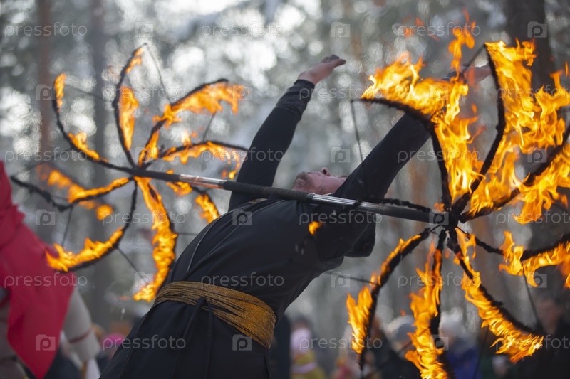 Огненное шоу. Танцы факира с посохами. Огонь и дым. Завораживающее движение пламени. Покорение стихии огня