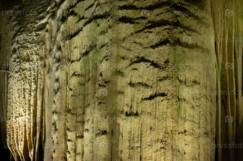Пещера карстовая, потрясающий вид на сталактиты и сталагниты, освещенные ярким светом, прекрасная природная достопримечательность в туристическом месте