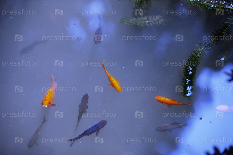 Золотые рыбки плавают в голубой воде. Маленький пруд