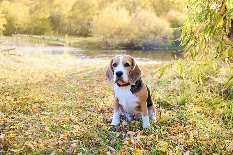 Осенняя концепция. Собака породы бигль в желтом шарфе сидит в сухой траве