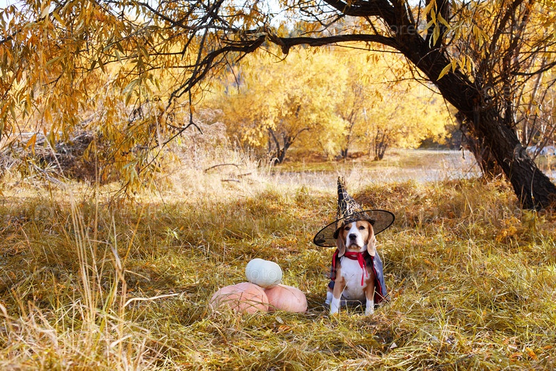 Открытка на Хэллоуин. Собака породы бигль в шляпе ведьмы сидит в осеннем парке