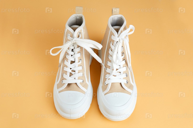 Пара бежевых кроссовок на изолированном оранжевом фоне. Кроссовки
