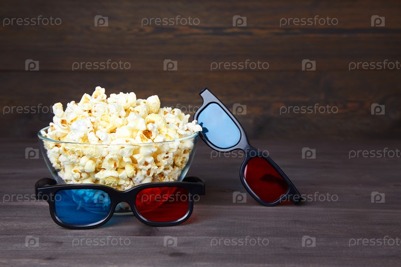 Тарелка с попкорном и 3D-очки для просмотра фильмов с друзьями