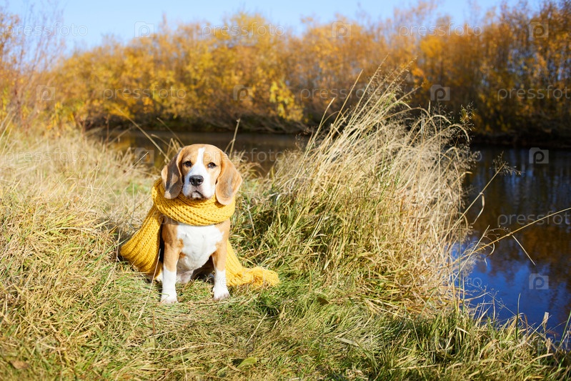 Осенняя концепция. Собака породы бигль в желтом шарфе сидит в сухой траве