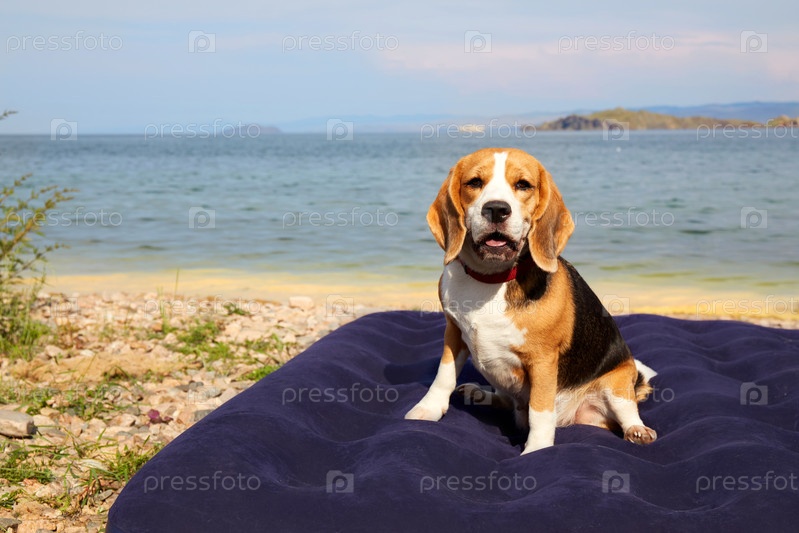 Собака породы бигль лежит на надувном матрасе на пляже у моря