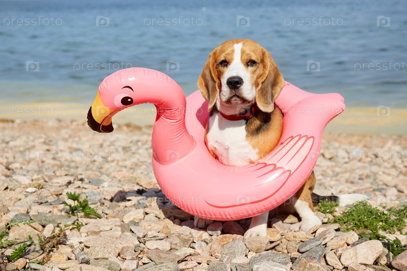 Собака породы бигль в надувном плавающем фламинго сидит на галечном пляже у моря