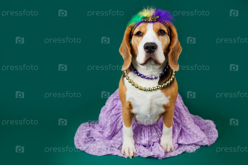 Собака породы бигль в костюме для фестиваля Марди Гра