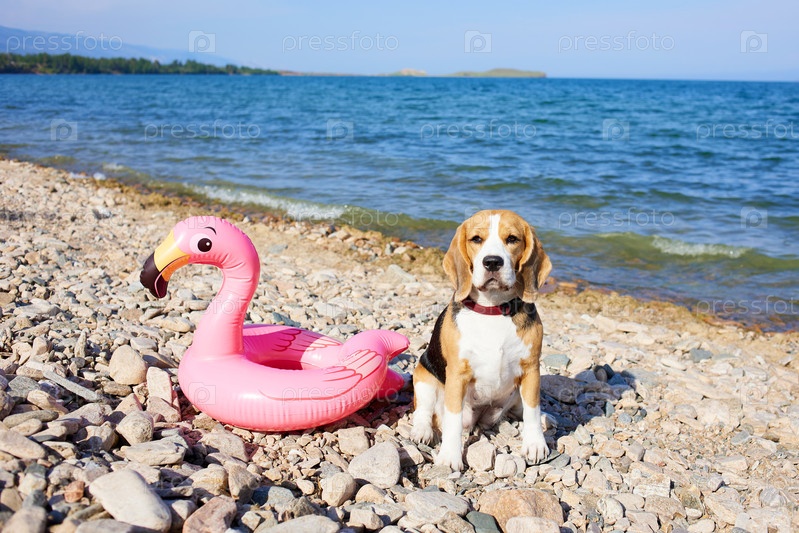 Собака породы бигль сидит на галечном пляже