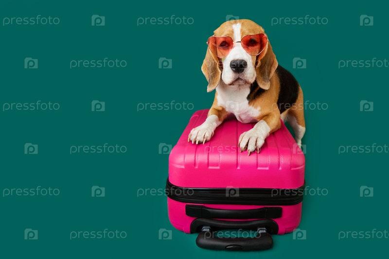 Собака породы бигль в солнцезащитных очках на чемодане