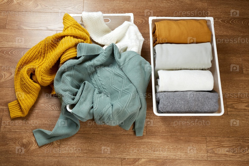 Корзины с аккуратными стопками одежды и разбросанная куча вязаных вещей