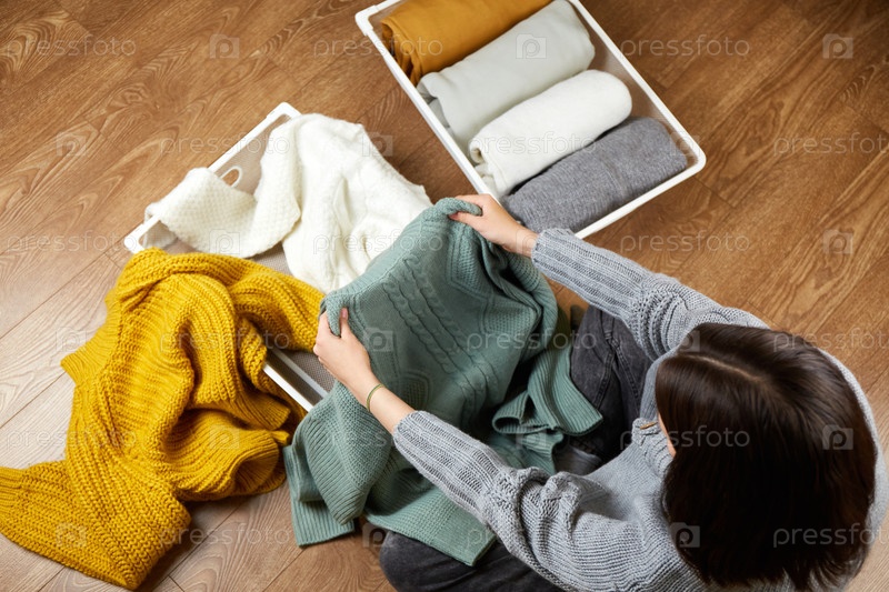 Молодая женщина складывает вязаные вещи в металлическую корзину для белья