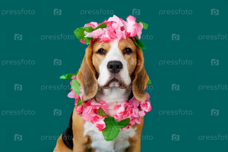Собака породы бигль в гавайском цветочном декоре на зеленом фоне