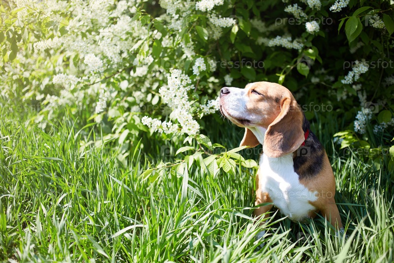 Милая собака породы бигль сидит на зеленой траве у цветущего куста вишни