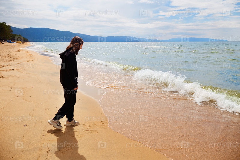 Девочка-подросток идет одна по песчаному пустынному пляжу озера Байкал