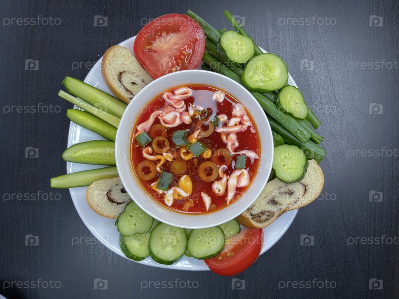 На столе стоит тарелка с супом-солянкой