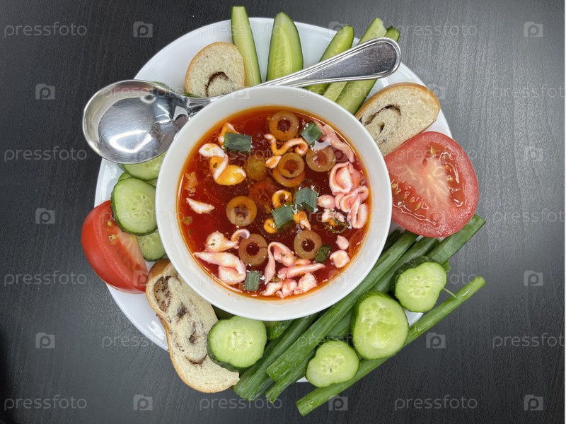 На столе стоит тарелка с супом-солянкой