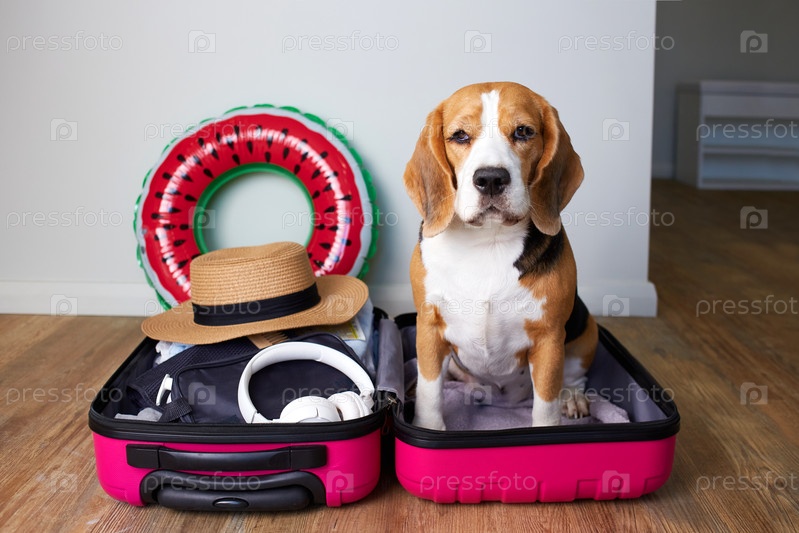 Собака породы бигль в соломенной шляпе сидит в чемодане с вещами и плавающим надувным кругом для летнего отдыха на море