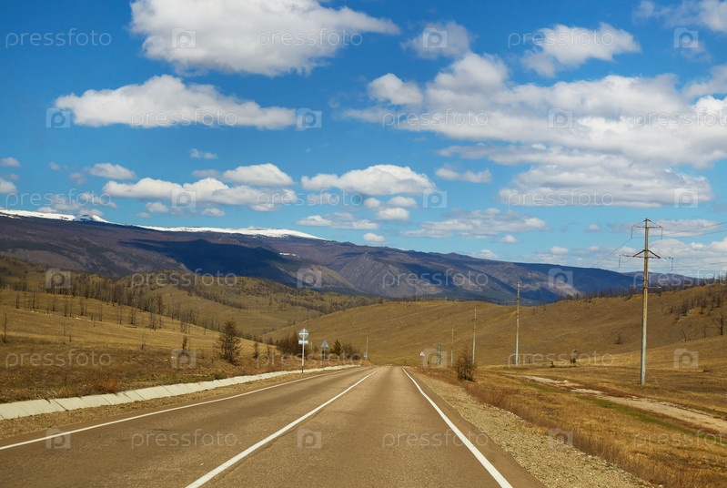 Асфальтированная пустая дорога к озеру Байкал. Красивый весенний пейзаж