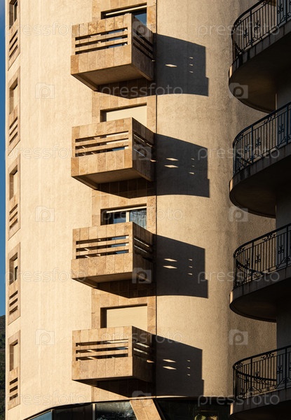 Балконы с тенью от заходящего солнца. Будва, Черногория. Январь 2023
