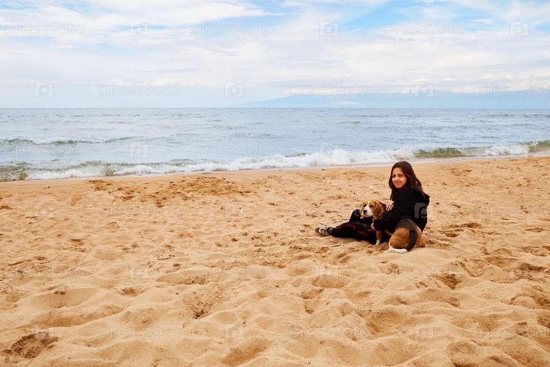 Девочка-подросток со своей собакой породы бигль сидит на песчаном пляже