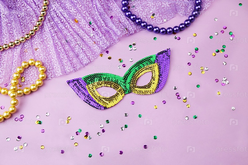 Украшения для фестиваля Марди, карнавальная маска, бусы, конфетти на сиреневом фоне