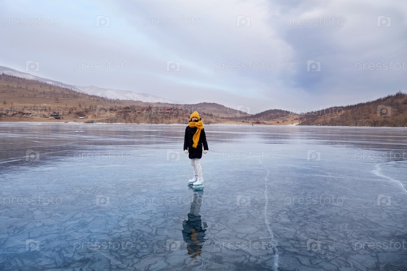 Молодая девушка катается на коньках по прозрачному льду замерзшего озера Байкал