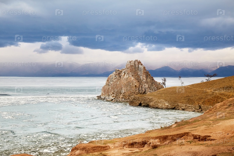 Прекрасный вид на мыс Бурхан на острове Ольхон в пасмурный весенний день