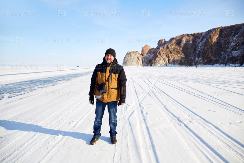 Замерзшее озеро Байкал в солнечный зимний день. Мужчина стоит на льду