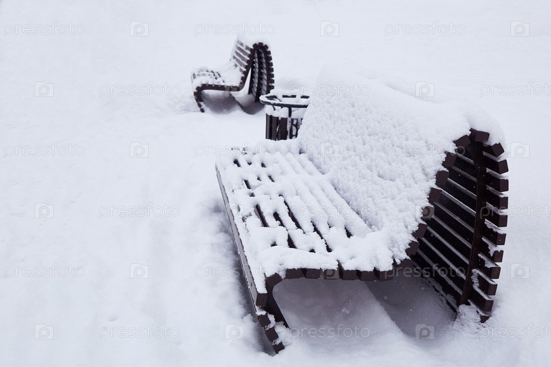 Деревянные скамейки в снегу в городском парке. Сильный снегопад, сугробы