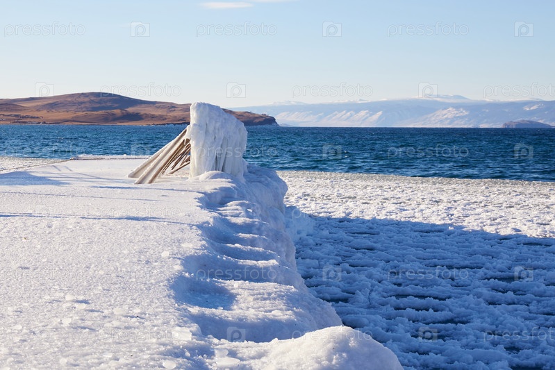 Красивый зимний пейзаж. Замерзший пирс, льдины и снег у берега