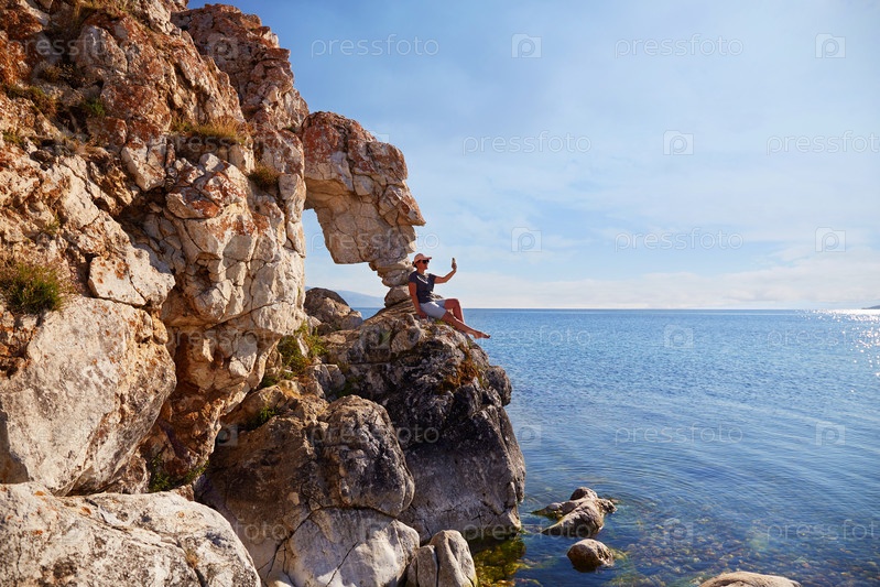 Девушка сидит на камне и любуется прекрасным видом на озеро Байкал