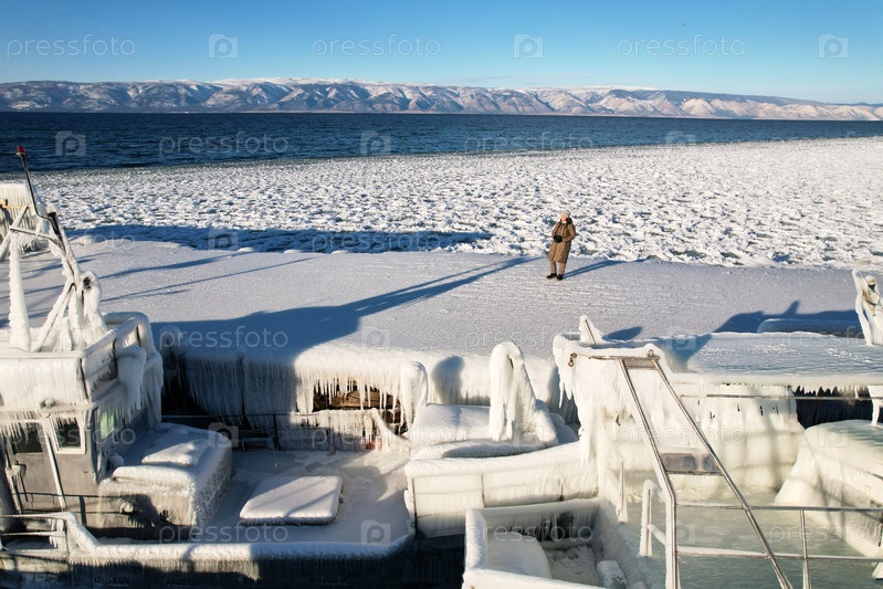 Замерзший пирс и корабли, льдины и снег у берега, вода в озере Байкал