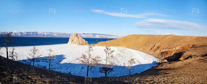 Панорамный вид на залив Хужир, скалу Шаманка или мыс Бурхан