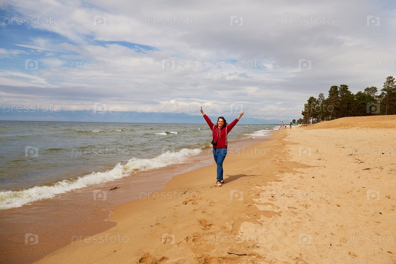 Счастливая путешественница идет по песчаному пляжу. Летние каникулы