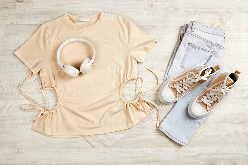 Повседневный женский наряд. Бежевая футболка, синие джинсы и кроссовки