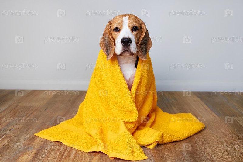 Собака породы бигль в сером полотенце после купания