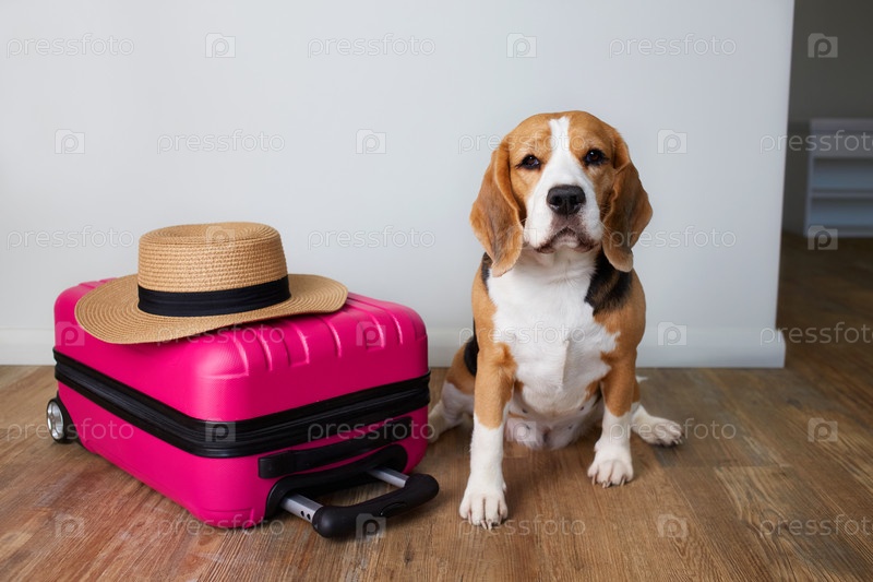Собака породы бигль в соломенной шляпе сидит возле чемодана