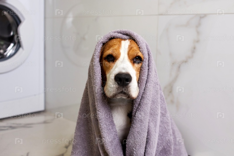 Собака породы бигль в сером полотенце после купания. Интерьер современной ванной комнаты
