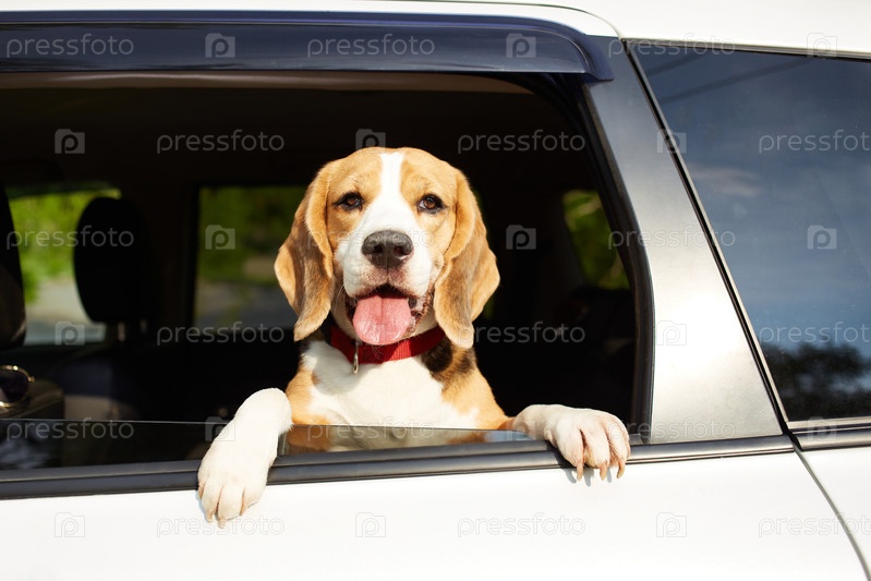 Собака путешествует на машине. Милая собака породы бигль смотрит из окна машины