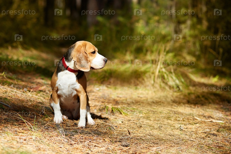 Собака породы бигль сидит в красочном осеннем лесу