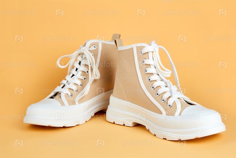 Бежевые кроссовки Converse на изолированном оранжевом фоне