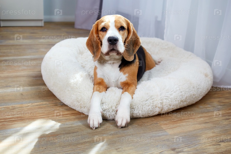 Собака породы бигль лежит на собачьей лежанке