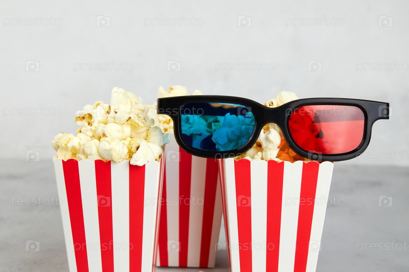 Попкорн, 3D-очки для просмотра фильмов на сером фоне