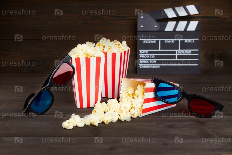 Попкорн, 3D-очки, вагон на темном деревянном фоне