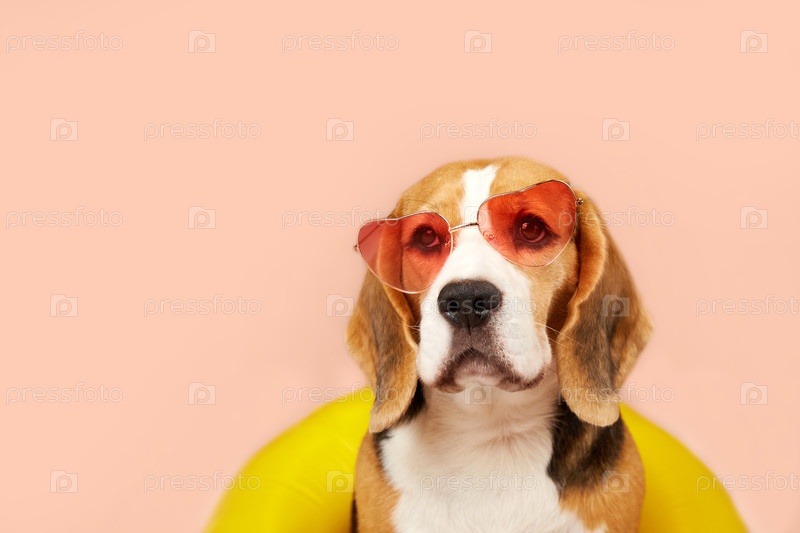 Милая собака породы бигль в солнцезащитных очках и с плавательным кругом