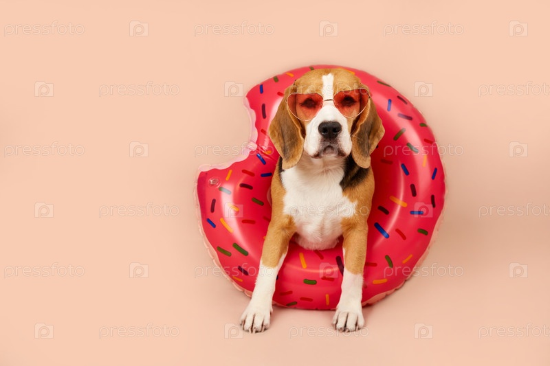 Милая собака породы бигль в солнцезащитных очках и с плавательным кругом