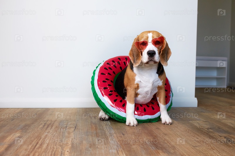 Милая собака породы бигль в солнцезащитных очках и с плавательным кругом
