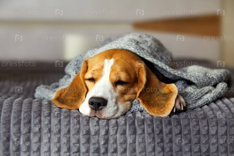 Собака породы бигль спит на кровати под серым вязаным одеялом