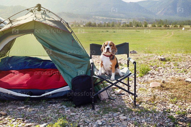 Собака породы бигль сидит на походном стуле рядом с палаткой