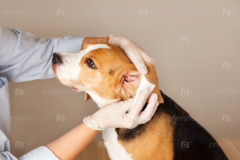Ветеринар чистит уши бигля салфеткой